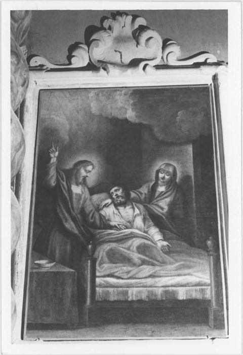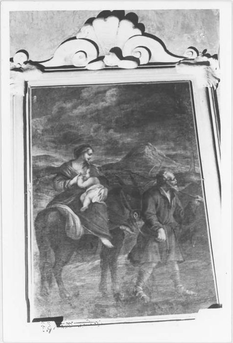L'encadrement de gypserie comporte une grande coquille pour la Fuite en Egypte et un cartouche pour la Mort de Saint Joseph.