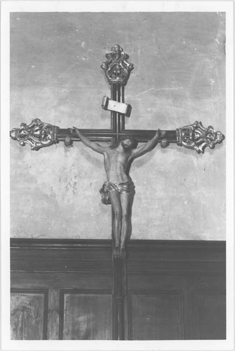 La croix, peinte en laque noire, a des embouts sculptés de motifs végétaux stylisés dorés inscrits dans une figure lancéolée.
