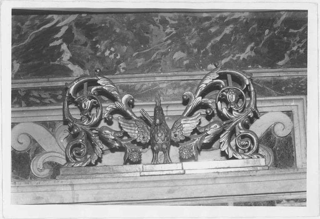 Chandelier à sept branches avec, au centre, un pélican aux ailes déployées. Des rinceaux de feuilles et de fleurs l'encadrent.