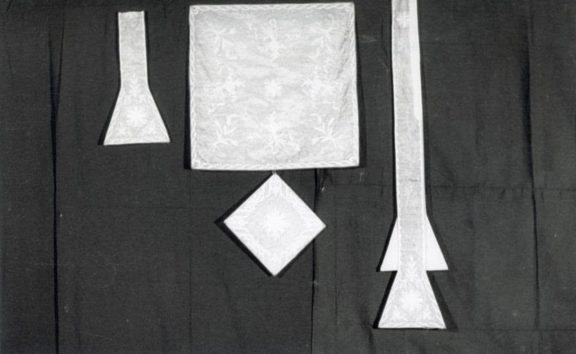 chape ; chasuble ; dalmatique ; voile huméral ; étole de clerc ; manipule ; voile de calice ; bourse de corporal