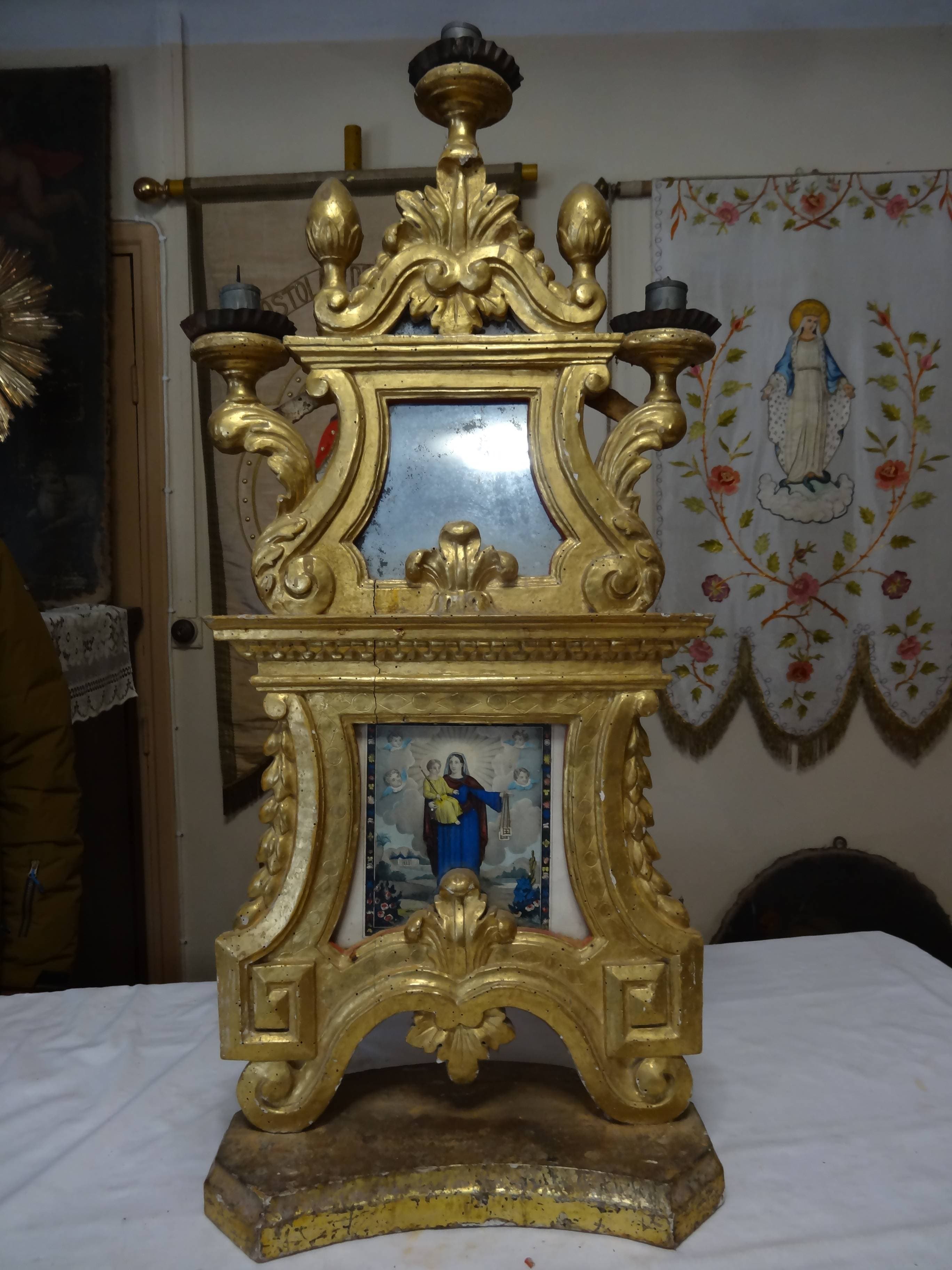 Deux panneaux à bords chantournés et miroirs munis de 3 flambeaux chacun avec deux gravures en taille douce figurant Notre Dame du Mont Carmel et Notre Dame du Rosaire.