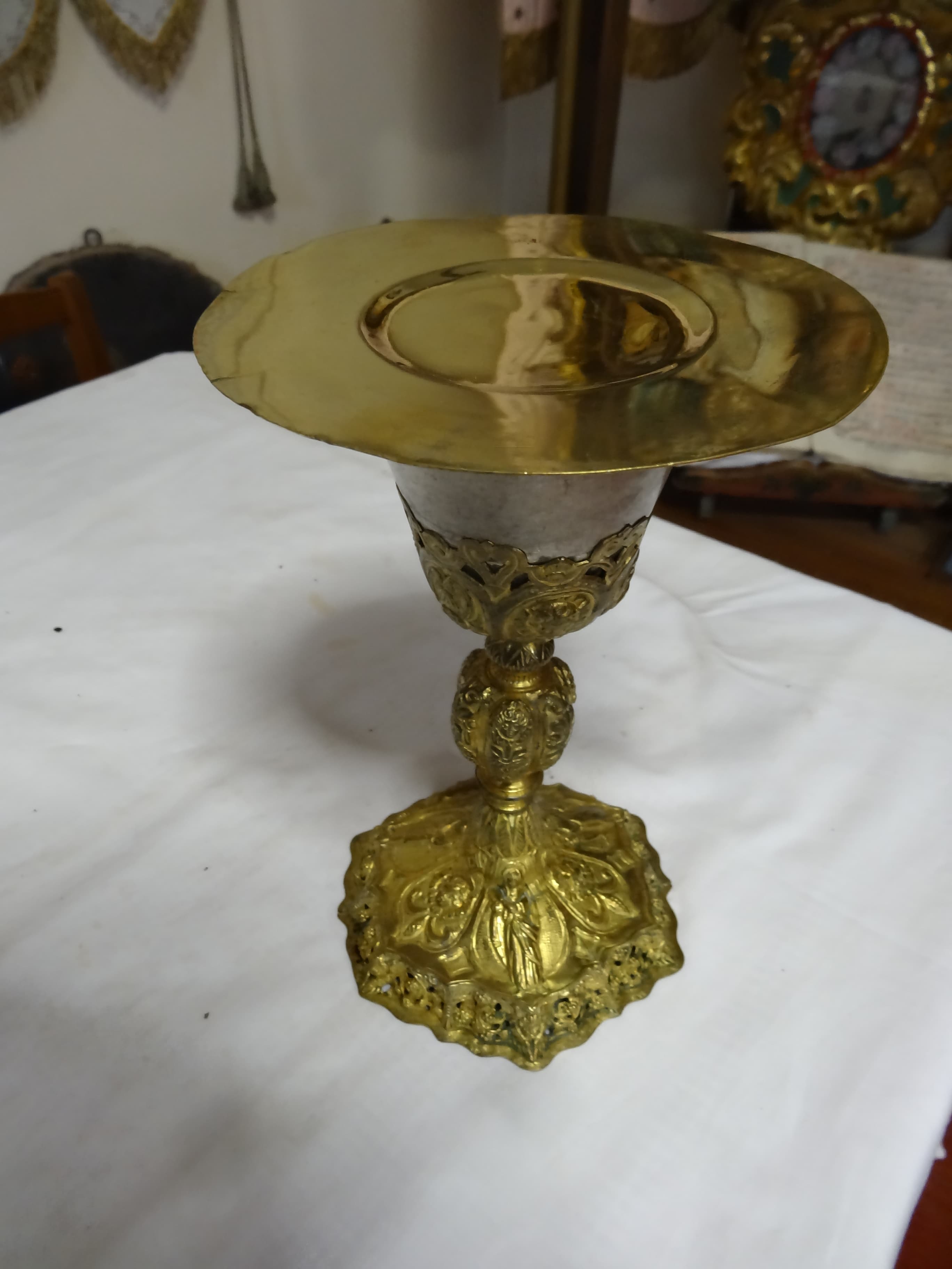 Patène moderne en cuivre doré, coupe du calice en argent.