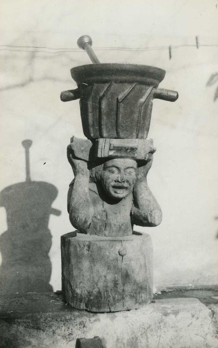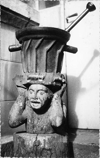 Mortier en fonte de fer et billot en bois sculpté avec polychromie.