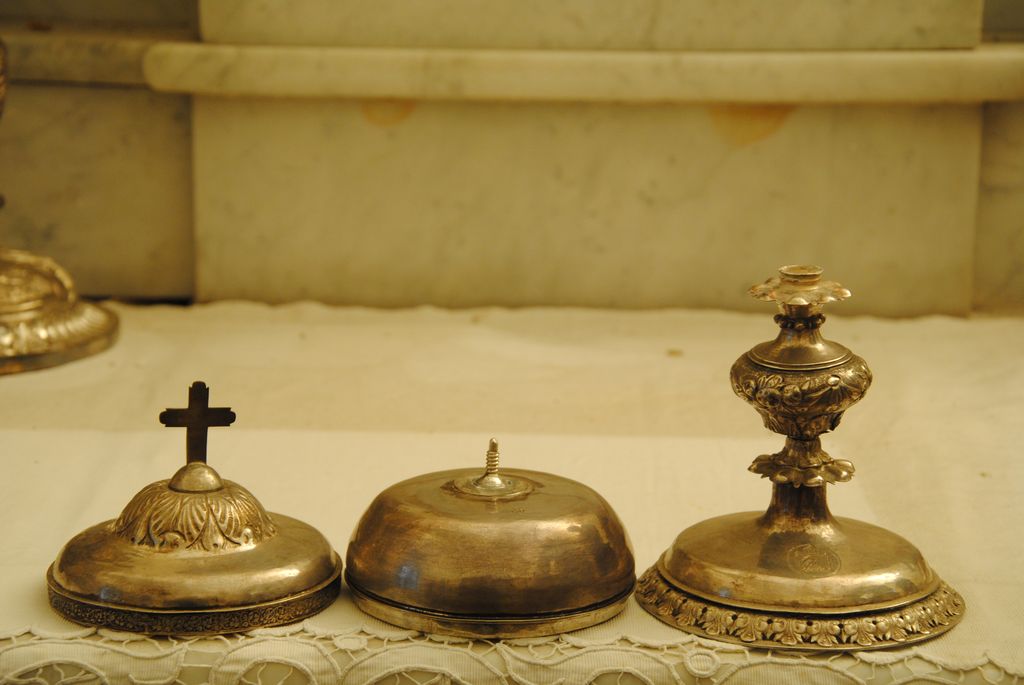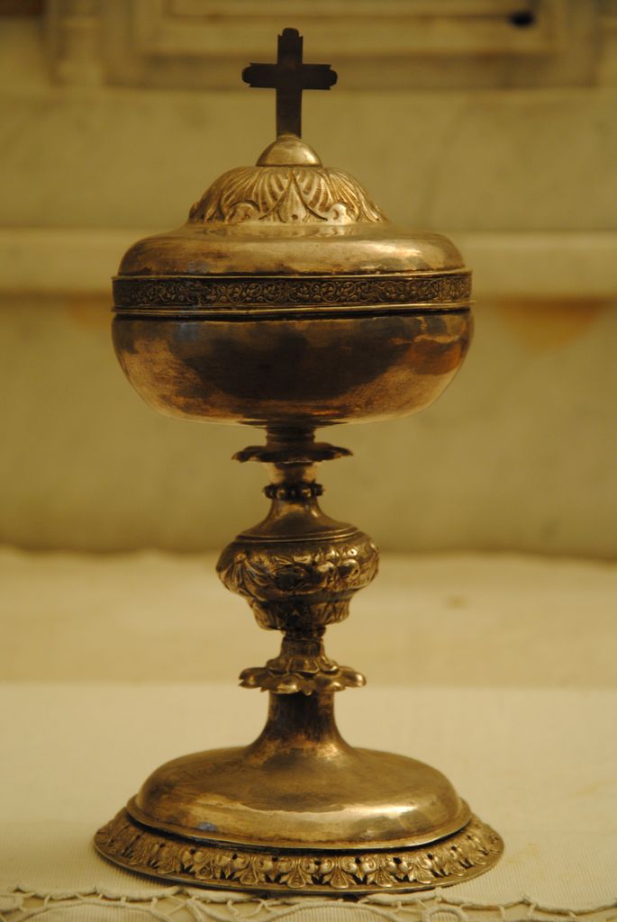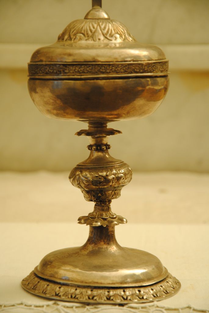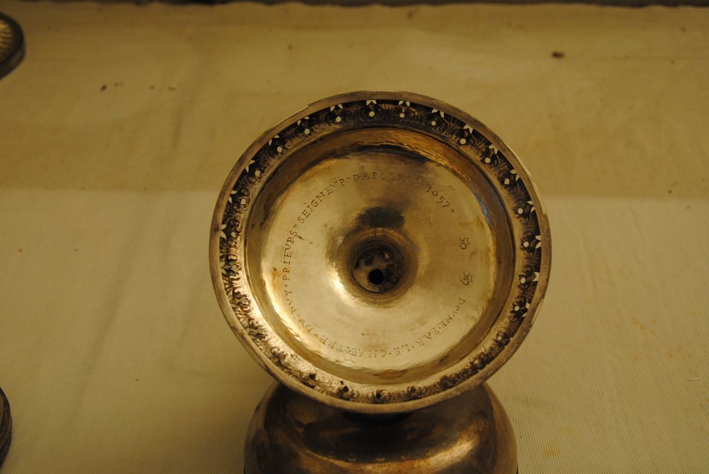 Porte gravée sur son socle l'inscription suivante : DONNE PAR LE CHAPITRE DU PUY PRIEUR SEIGNEUR D'ARLEBOSC 1657. Porte deux poinçons identiques sur son socle et un de même sur le coupe.