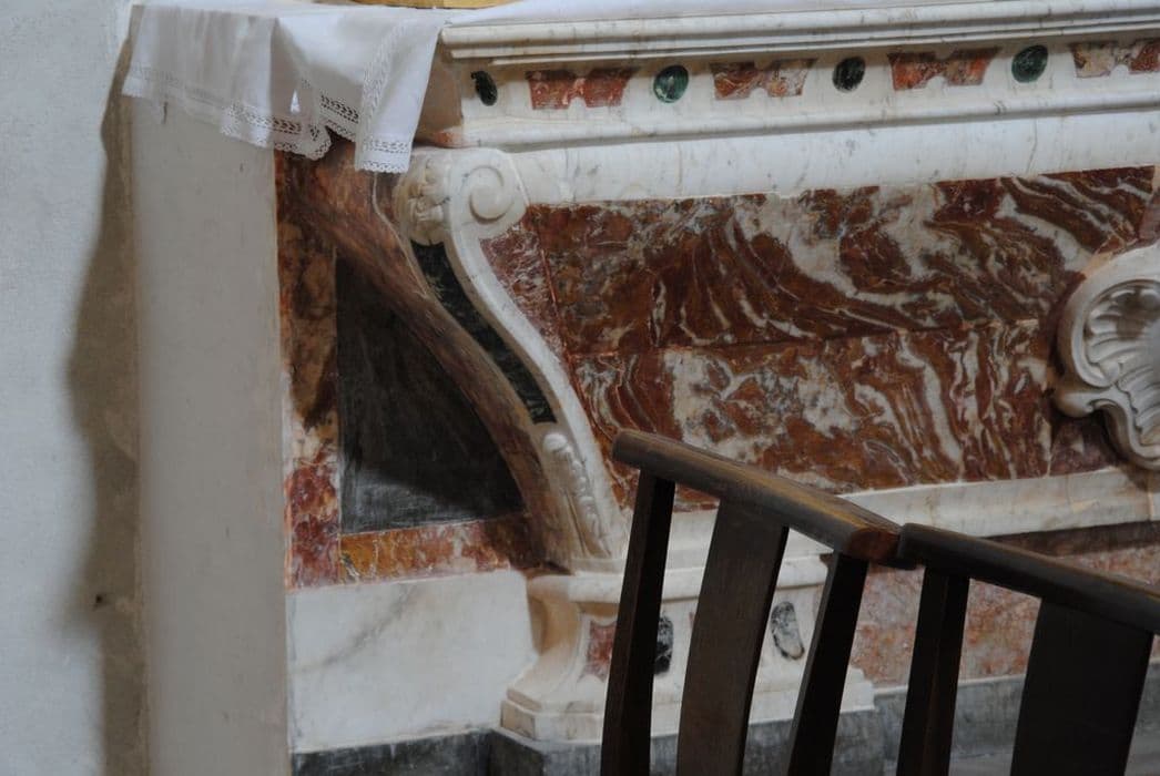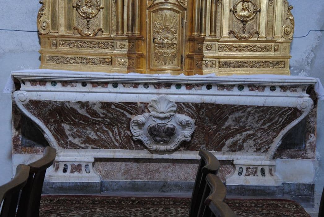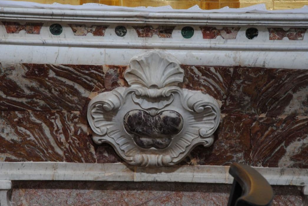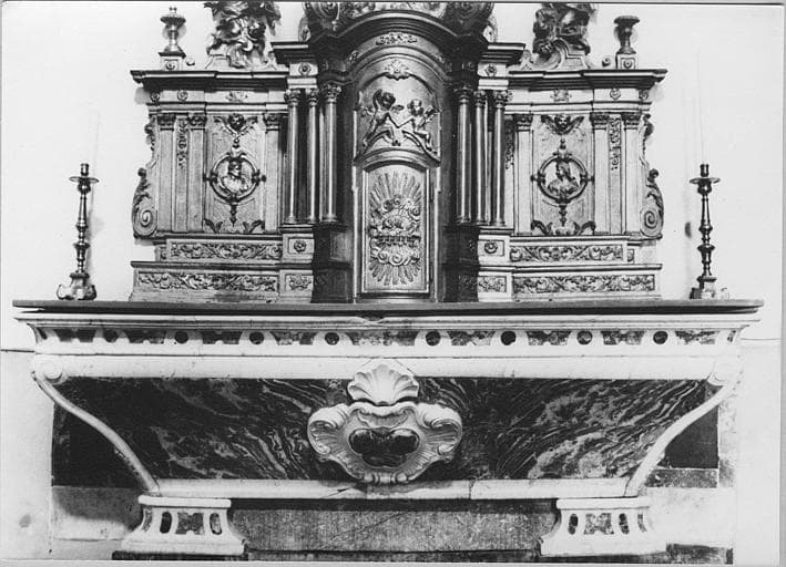 Autel galbé en marbre blanc et fond de marbre rouge du Languedoc avec incrustations de marbre blanc et vert.