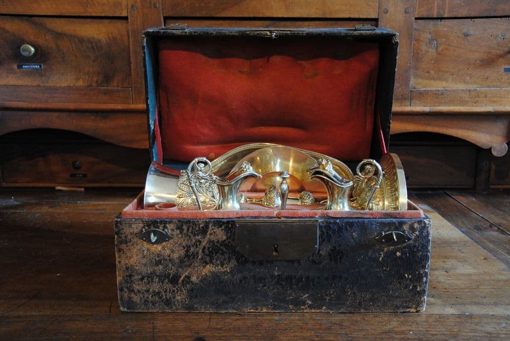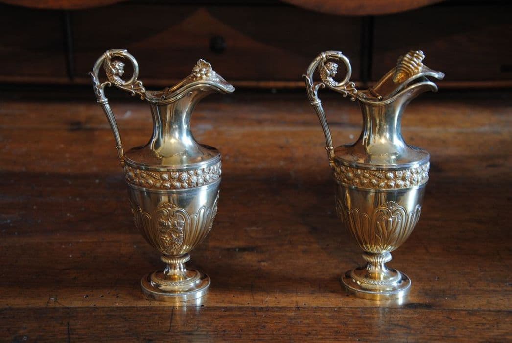 calice, patène, burettes, plateau à burettes, sonnette d'autel