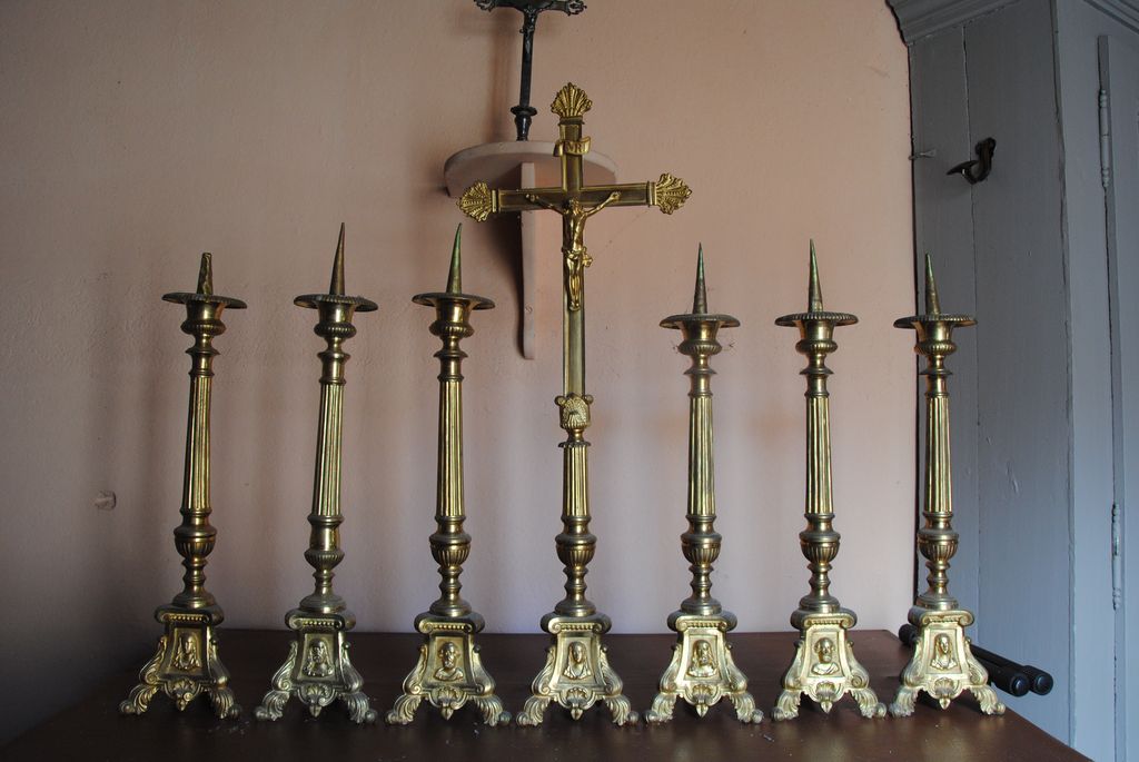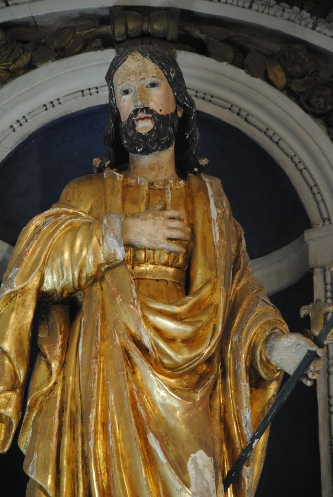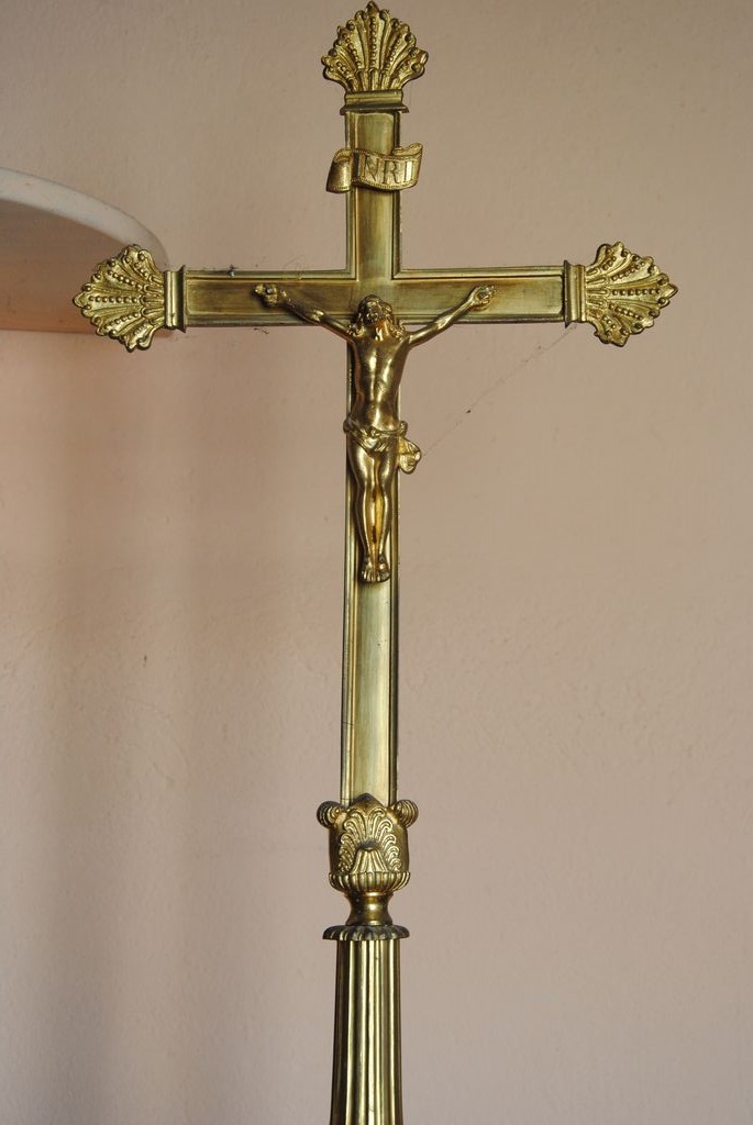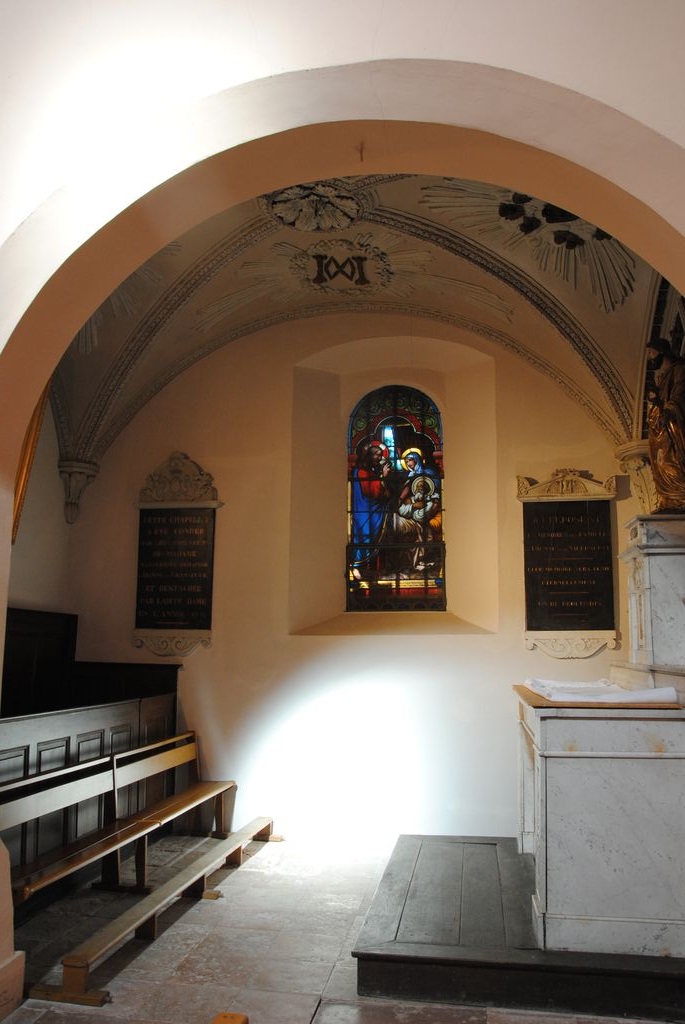 décor d'architecture ; autel ; retable ; peinture monumentale ; statue ; plaque funéraire ; croix ; chandelier d'autel ; banc de famille