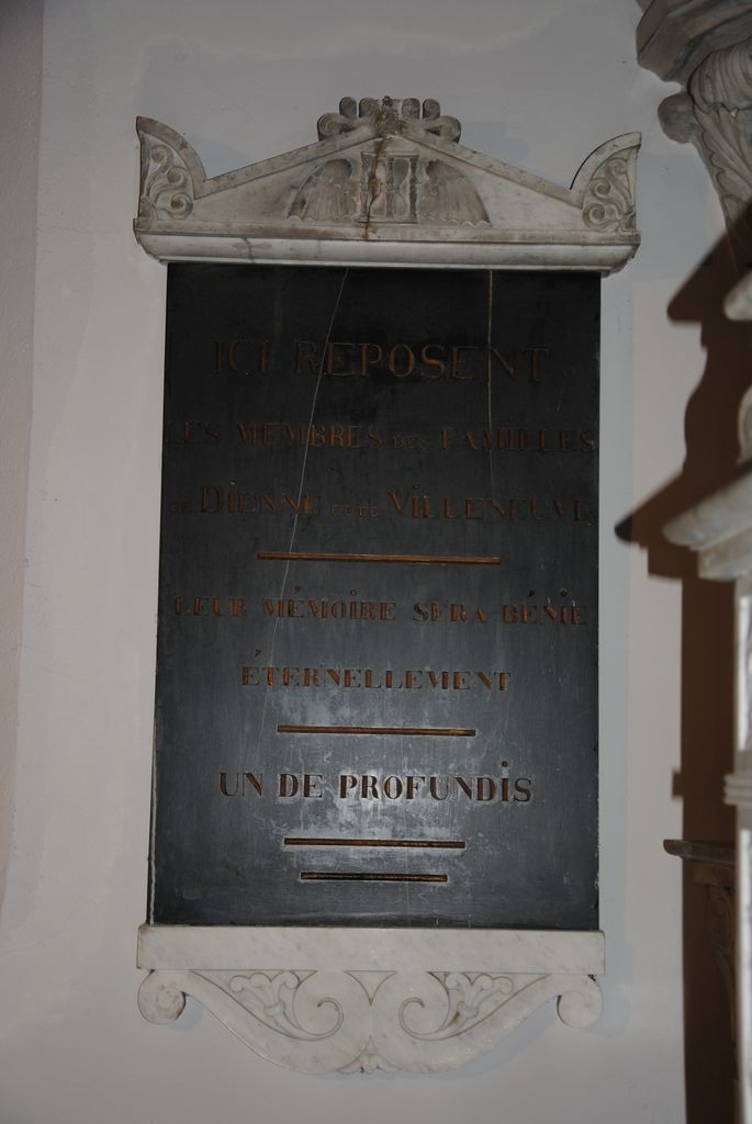 décor de la chapelle du Sacré-Coeur : décor d'architecture ; autel ; retable ; peinture monumentale (peintures de la voûte) ; statue du Sacré-Coeur ; plaque funéraire à la mémoire de la famille de Dienne ; croix ; chandelier d'autel ; banc de famille (avec agenouilloir de la famille de Dienne)