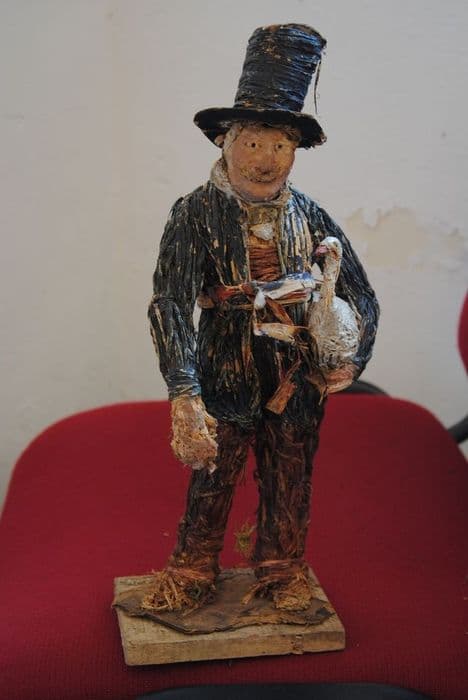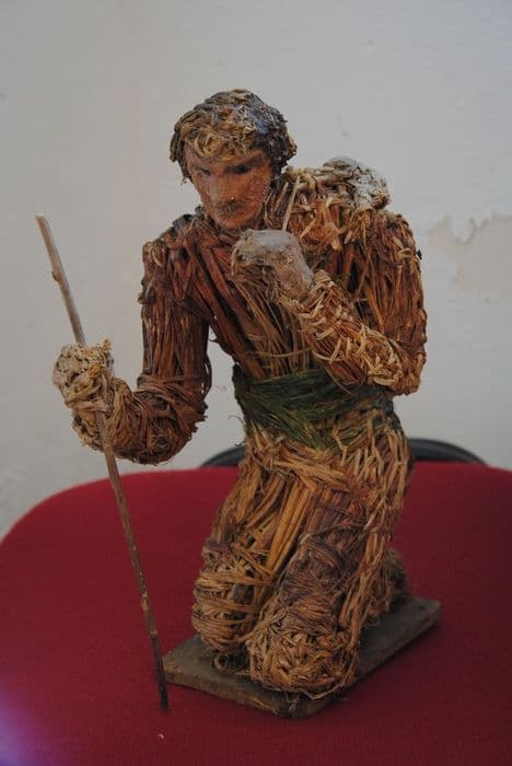 Crèche d'une quinzaine de personnages : berger, pêcheur, personnages de la vie quotidienne, roi mages montés sur des animaux... de 30 cm à 1 m de hauteur.