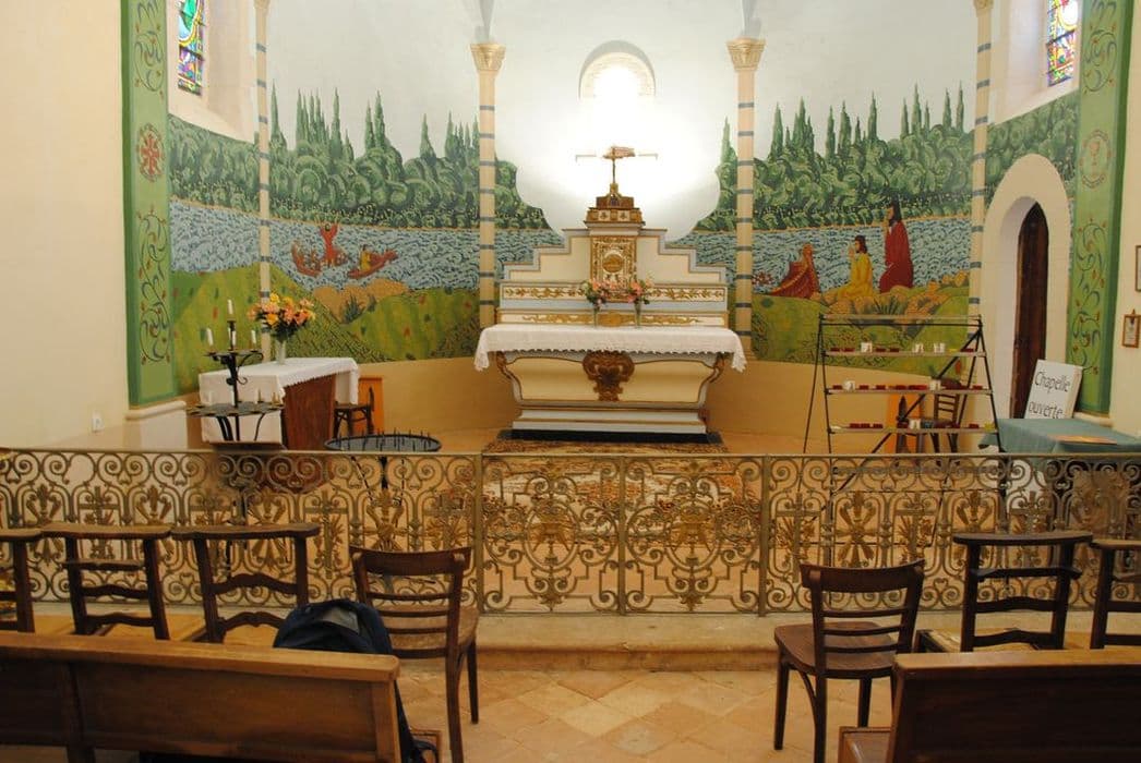 POP | Plateforme ouverte du patrimoinedécor de l'ensemble de la Chapelle dont les peintures murales, les tableaux, l'autel, la table de communion, les sièges, le chemin de croix, les appliques électriques