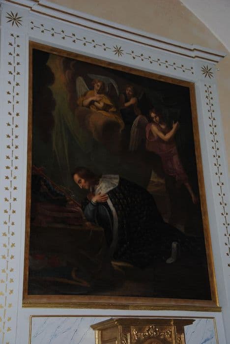 Saint Louis agenouillé, en prière, surmonté de trois figures d'anges.