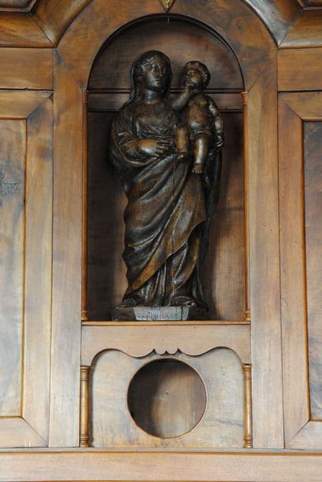 meuble de sacristie : crédence avec niche renfermant une statue de la Vierge à l'Enfant, le Christ en Croix, la Vierge à l'Enfant sur le globe