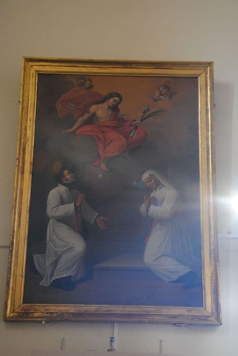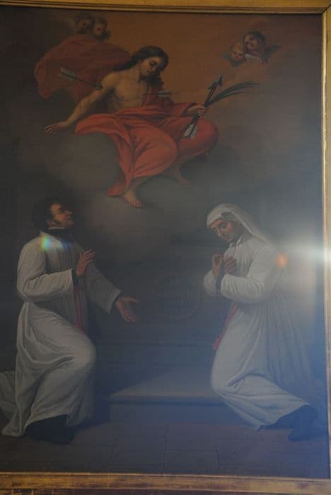 Le Christ est percé de flèches dans une gloire avec à ses pieds un religieux et une religieuse agenouillés, tous deux vêtus de blanc.