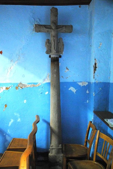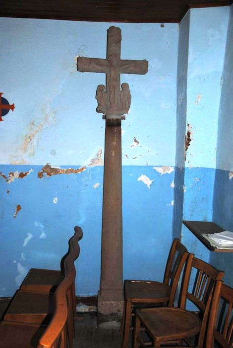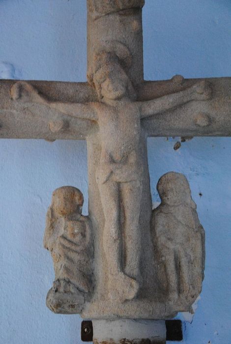 Croix scellée sur un mur. La face antérieure présente la figure du Christ ; la face postérieure, une Vierge à l'Enfant non visible.