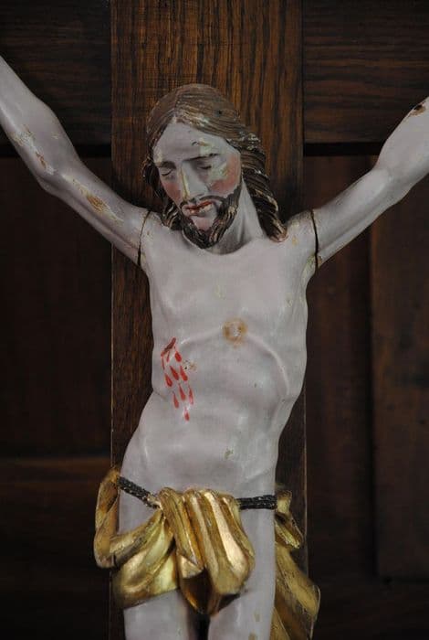 Christ replacé sur une croix récente avec socle en bois décapé.