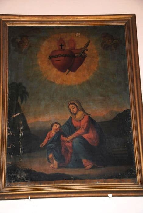 tableau : La Vierge et l'Enfant surmontée des Saints Coeurs de Jésus et de Marie
