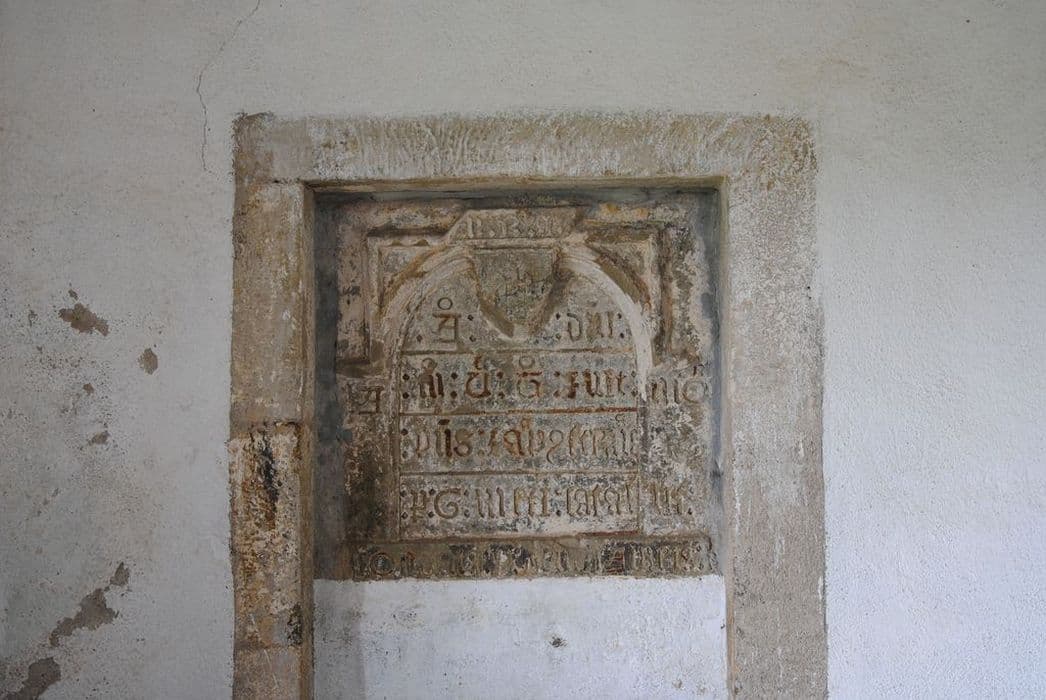 plaque commémorative : inscription en caractères gothiques indiquant la date de fondation d'une ancienne chapelle dédiée à saint Romain