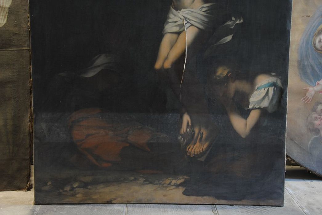 Christ agonisant sur la croix avec à ses pieds les trois Marie : La Vierge évanouie dans les bras de sa sur et Marie Madeleine en prière au premier plan.