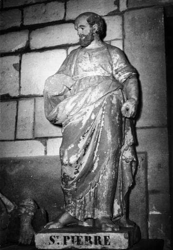 Ronde bosse représentant saint Pierre, debout, drapé dans ses vêtements, ayant perdu la clé qu'il devait tenir dans sa main gauche. Dans sa main droite, il tient un livre, fragment brisé mais existant, actuellement déposé aux pieds du saint.