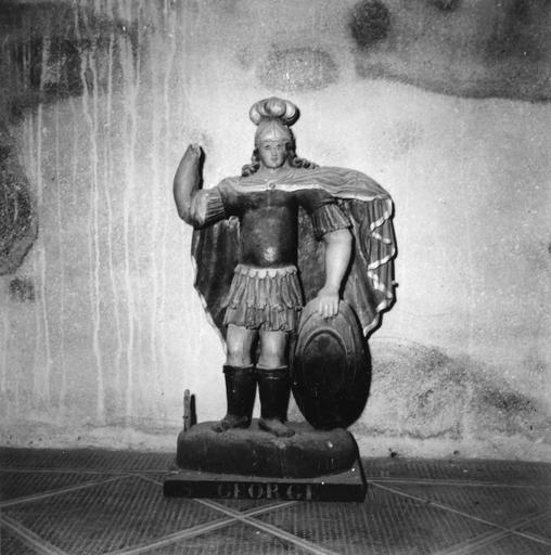 Sculpture en ronde bosse représentant saint Georges, chevalier armé, main gauche posée sur le bouclier, main droite le vée devant tenir la lance aujourd'hui brisée, dont on aperçoit la base. Casque rouge et or, cheveux noirs bouclés, tunique brune, ceinture dorée, manteau flottant rouge bordé d'or et doublé de bleu roi. Bottes noires, ainsi que le bouclier.