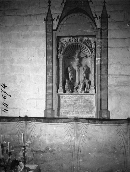 Ce bas-relief représente un Calvaire dans une niche sculptée.
