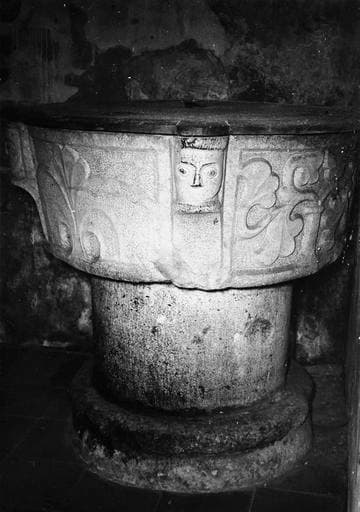 Fonts baptismaux de style gothique avec cuve cantonnée de quatre têtes d'angles de type cylindrique, orné sur ses quatre faces de motifs d'inspiration végétale.