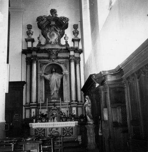 Maître-autel, tabernacle, retable et sa toile représentant 'Le Calvaire', deux autels secondaires portant des statues d'art saint-sulpicien.