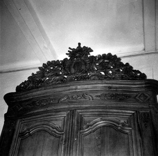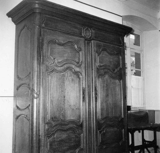 L'armoire possède deux portes avec un meneau fixé à la porte gauche. les portes et les côtés sont divisés en trois panneaux. Une belle mouluration mouvementée les souligne. Une importante corniche coiffe le meuble. Les deux pieds de la façade de l'armoire ont des sculptures originales. Les traverses hautes et basses présentent également une mouluration. Des sculptures ornent le centre. Sur la traverse haute, une marguerite a été sculptée. Sur celle du bas, on peut voir une croix de Malte. L'intérieur comporte 5 étagères.