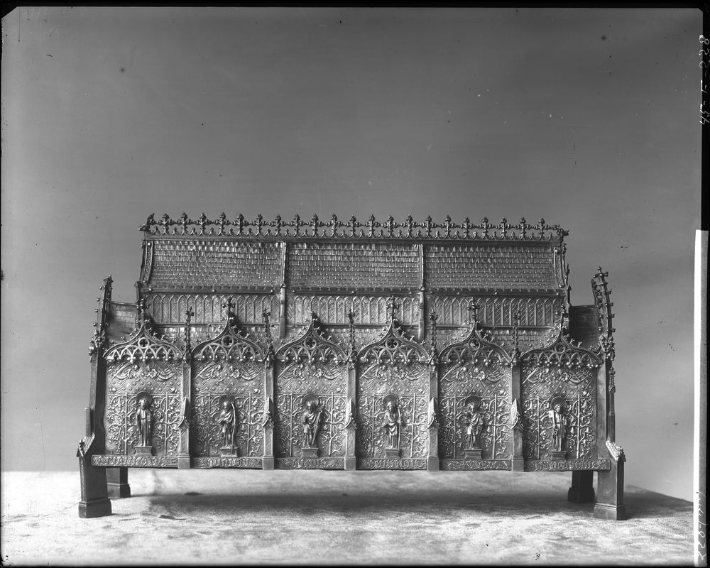 Reliquaire en forme d'église à trois nefs. Sur les côtés, six accolades au-dessous desuqelles figurent des têtes d'apôtres. Une série d'arcatures garnit la face de la haute nef, que surmonte une toiture à crêts ajourés, dans les pignons d'Hubert et de sainte Marguerite. Inscription à la partie inférieure.