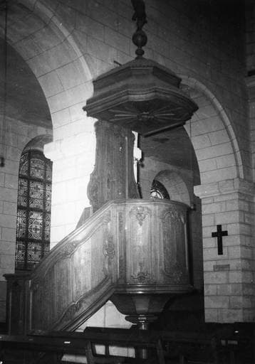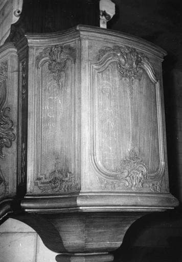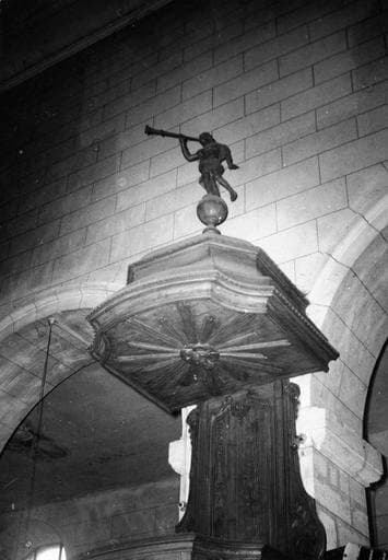 Chaire à prêcher avec rampe et panneaux de la cue ornés de motifssculptés d'inspiration végétale. A l'abat-voix un Saint-Esprit en gloire et au sommet un ange sonnant de la trompette céleste.