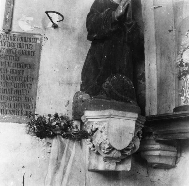 inscription : L'an mil Ve et VI fut commencée ceste chapelle des maries et la première messe chantée et je vous certifie vôute blanchie et achevée la M. Ve et XIIIe année par Jehan Lhomelet, prêtre de cette cure, jadis vicaire de cette ville, natif aussy. Vous, gens, pies pour luy, pour ses amis et parents et tous les bienfaiteurs de céans.