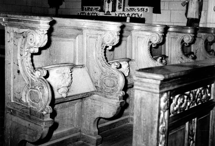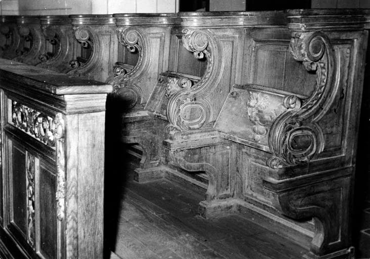 Bancs de stalles aux miséricordes sculptées de motifs d'inspiration végétale, toutes différentes les unes des autres. Cet ensemble mobilier comporte deux bancs d'angles de deux sièges chacun placés à l'entrée de la nef et de deux bancs droits composés de sept sièges chacun, soit au total 18 miséricordes sculptées. La balustre ajourée de ces deux bancs a été réalisée à une époque ultérieure à celle des stalles.