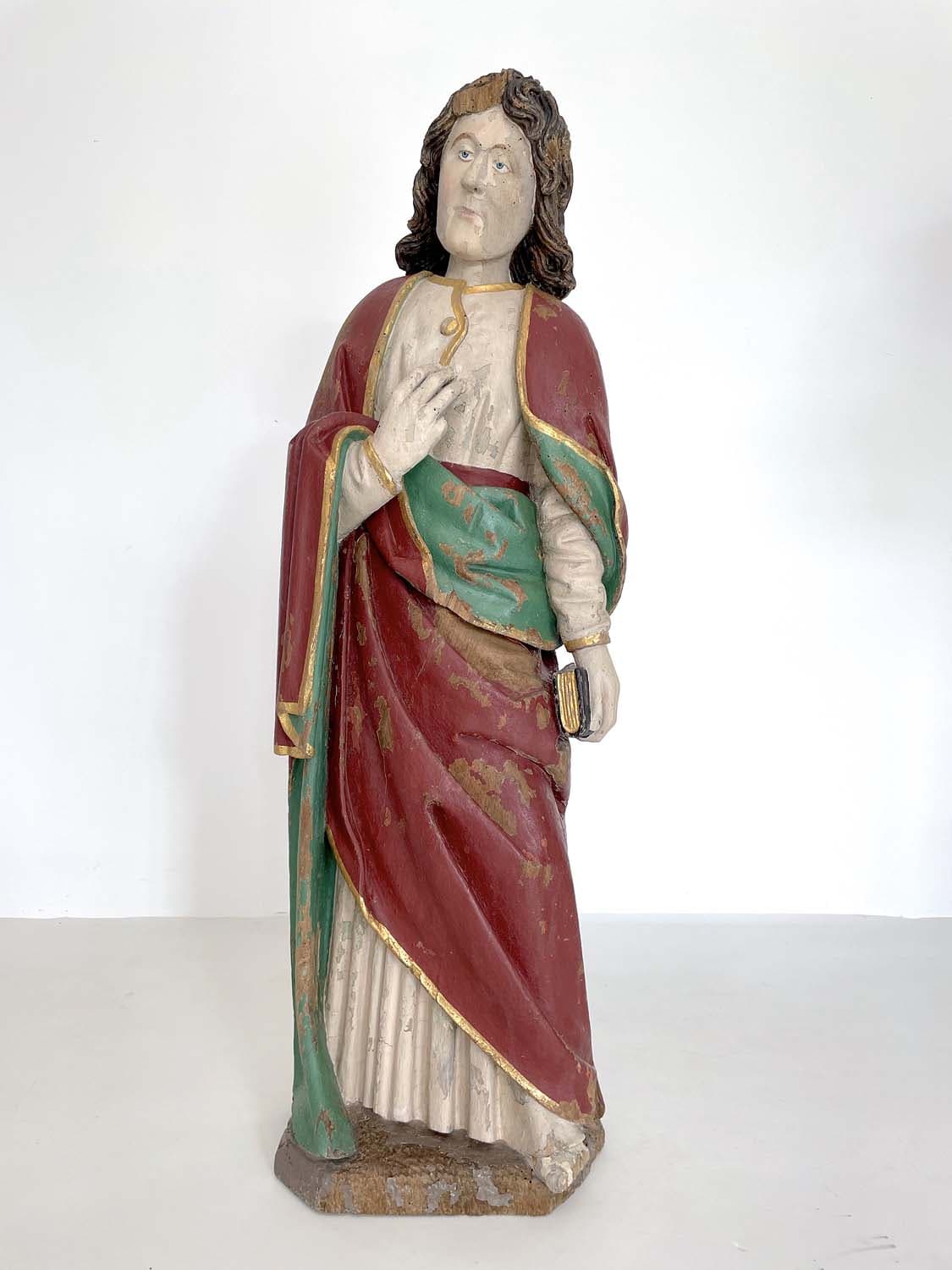 Statue en bois sculpté et peint représentant saint Jean, tenant un livre fermé dans la main gauche.