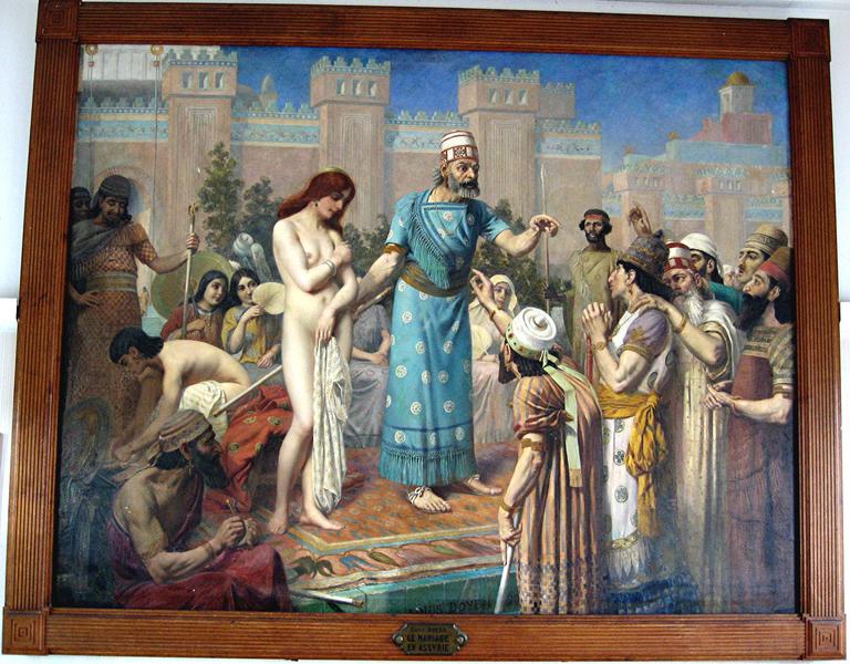 Ce tableau est l'oeuvre d'un enfant du pays, le peintre Louis-Marie Doyen (Attigny 1864-région parisienne 1943). Il porte la date 1896, et se place dans le courant de l'assyriomanie de la fin du 19e siècle, inspirée par les nombreux articles sur la Mésopotamie publiés dans l'Illustration et par les décors de briques du palais de Sargon II à Khorsabad rapportés au Louvre à cette époque. Présenté dans la salle des mariages depuis 1935, le titre en a été modifié, 'l'achat des épouses...' cédant la place au 'mariage en Assyrie'.