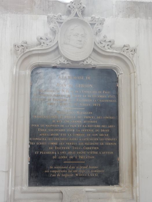 Plaque commémorative de Jean de Gerson, érigée en 1881 dans la nouvelle église par les soins de l'Académie de Reims. Elle a été réalisée par M. Bulteau, sculpteur à Reims, pour la somme de 600 francs recueillie à l´aide de souscriptions dont les principales sont dues à l´Académie de Reims, à la Société française d´archéologie, à Mgr Bourret, évêque de Rodez et à M. Dupré-Lasalle, conseiller à la cour de Cassation, qui ont tous deux retracé la vie de Gerson et à M. Natalis de Wailly, membre de l´Institut.