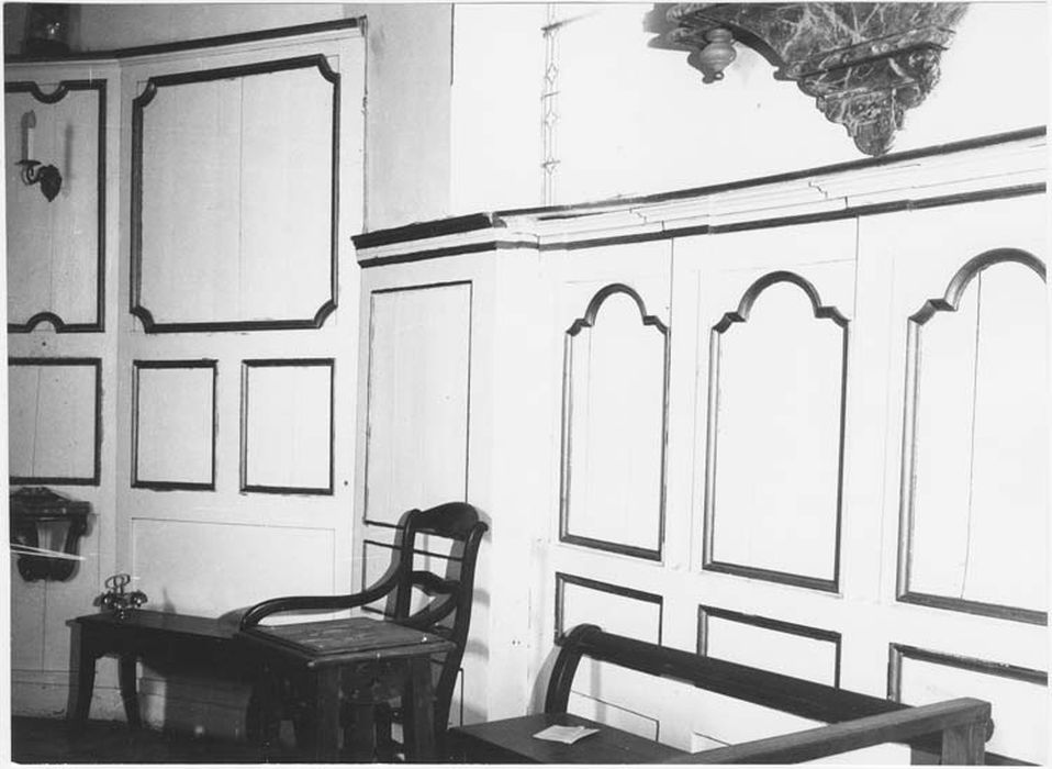 Lambris de demi-revêtement en bois peint blanc et rehauts dorés.