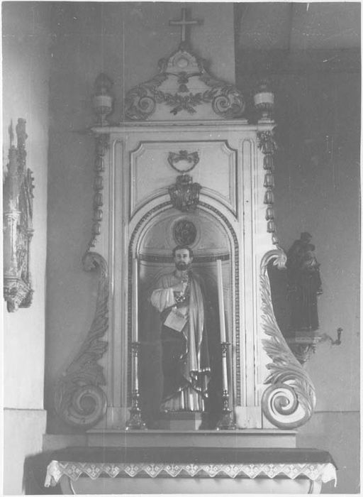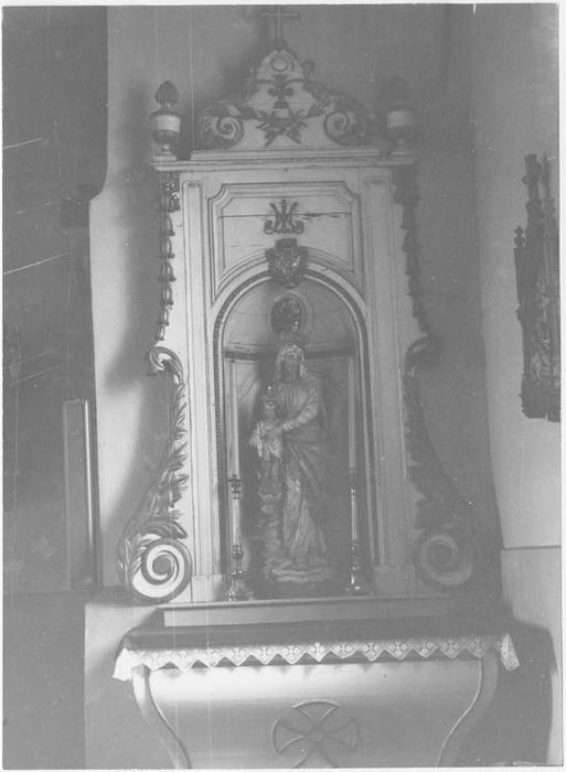 Autels secondaires en bois peint en blanc et rehauts dorés. Décor sculpté dans la masse. Autels galbés, avec retable percé d'une niche en plein cintre, frontons en volutes sur entablement rectiligne. On accède à chaque autel par deux degrés en bois brut.