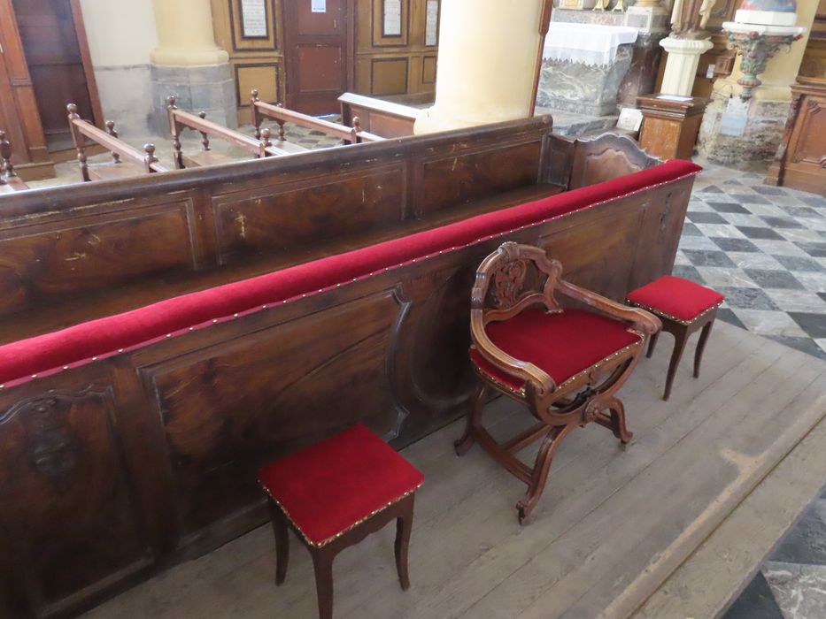 Bancs en bois peint faux bois insérés dans une structure basse comportant une petite porte d'entrée, un panneau de fond et un devant dont le rebord supérieur tient lieu d'appui et est doté d'une garniture en velours rouge. Décor plaqué.