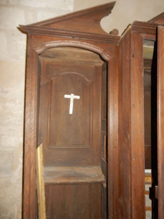 Confessionnal à trois loges. Porte centrale ajourée dans sa partie supérieure. Fronton triangulaire sur la loge centrale. Fronton entrecoupé sur les loges latérales.