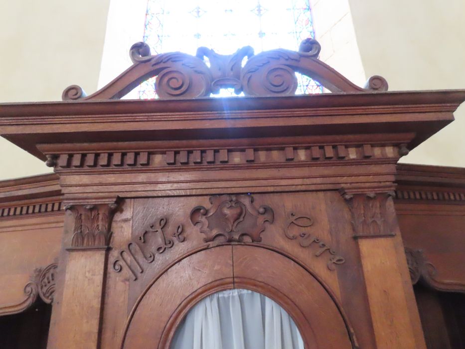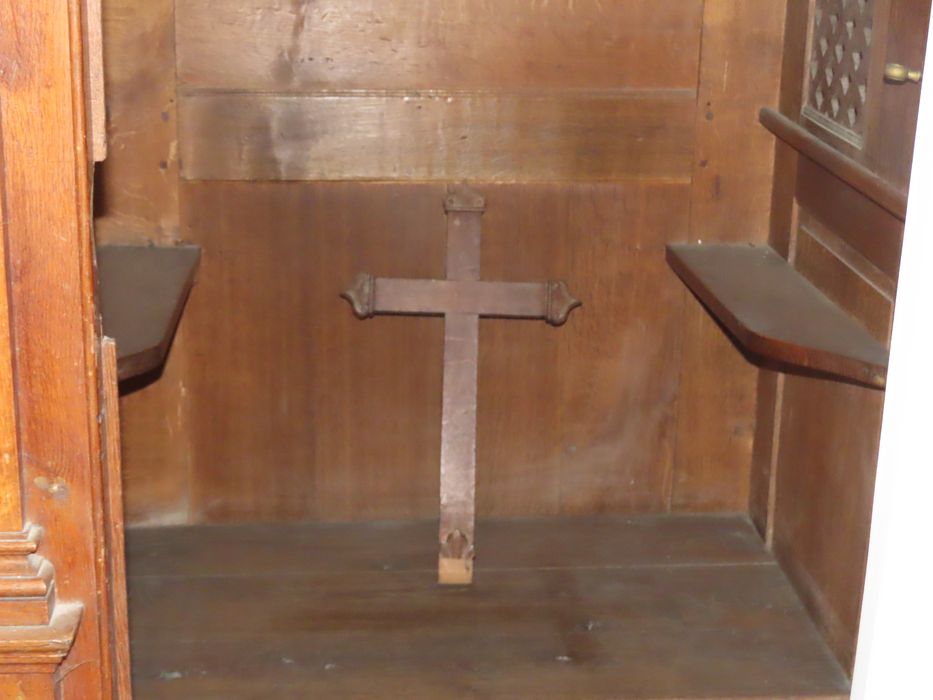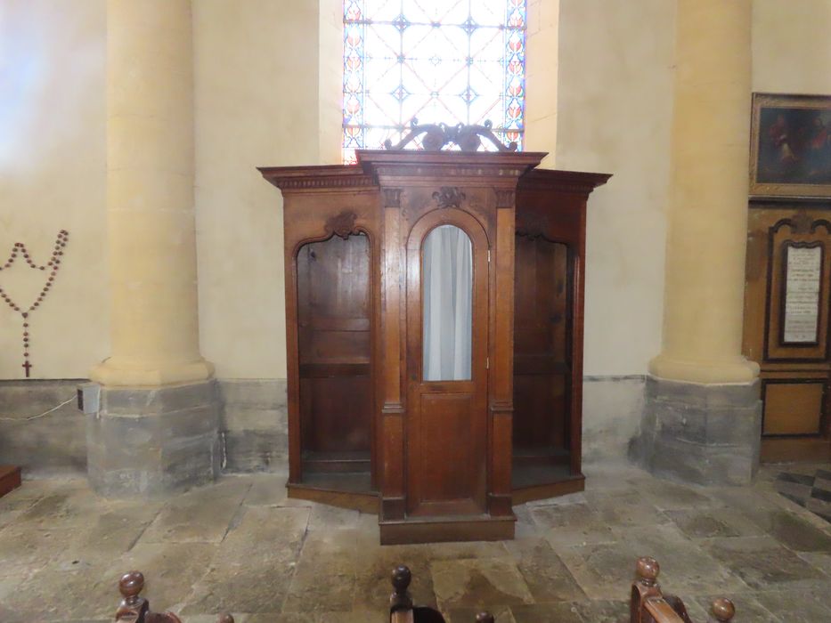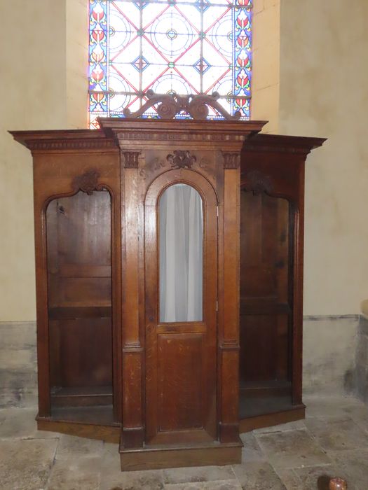 Confessionnal à trois loges. Loges latérales plus basses et ouvertes. La loge centrale, plus haute et coiffée d'un fronton, n'est fermée que par un battant de porte basse.