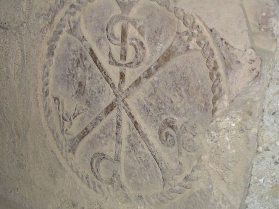 Chrisme scellé au-dessus de la porte d'entrée dans le porche, mais la porte romane est maintenant incluse dans la chapelle et le chrisme est caché dans l'escalier de la tribune. A noter que la pierre a été scéllée à l'envers.