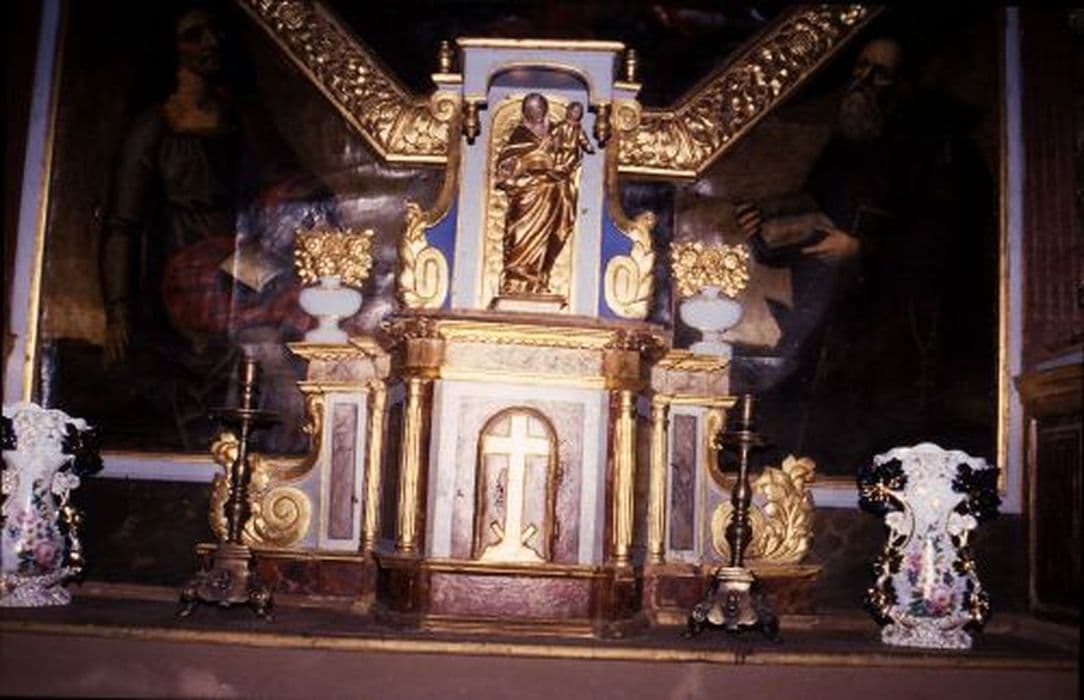 autel, retable, tabernacle, 3 statues, tableau : Vierge à l'Enfant, saint Joseph, saint Jean-Baptiste, Vierge à l'Enfant entourée d'un rosaire