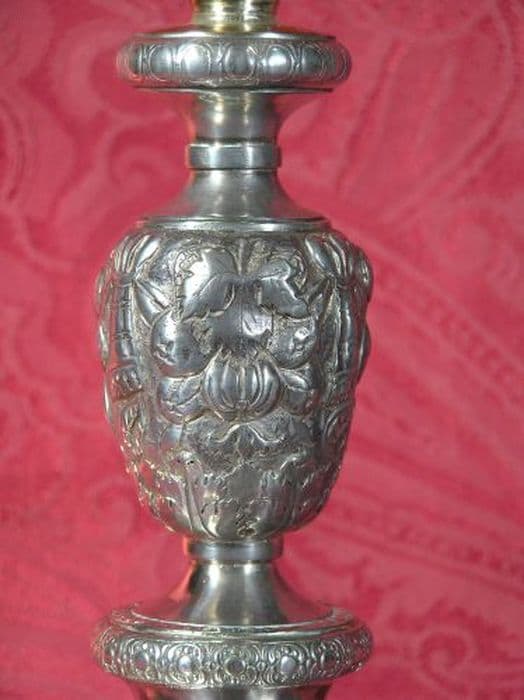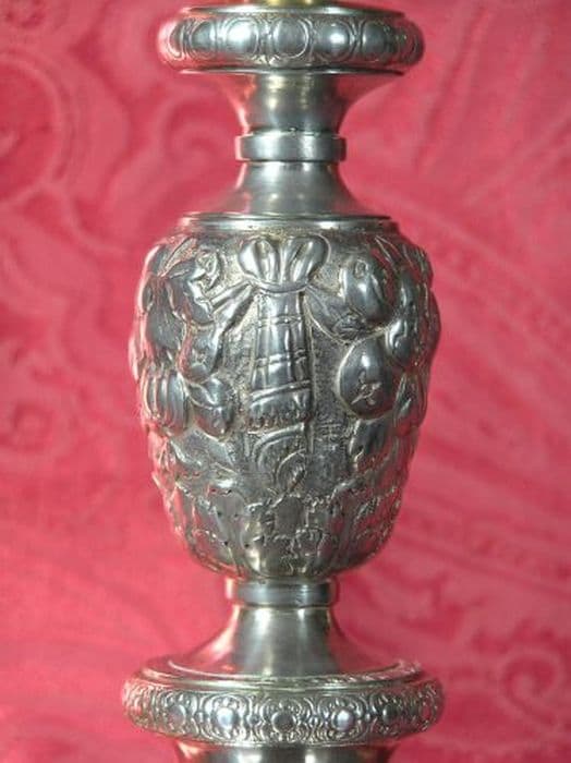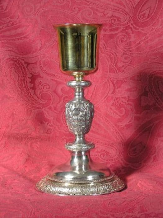 Calice en argent, coupe en vermeil, pied à bordure ajourée, noeud avec fruits, croix gravée au pied. Patène vermeil.