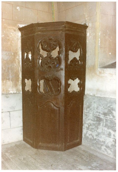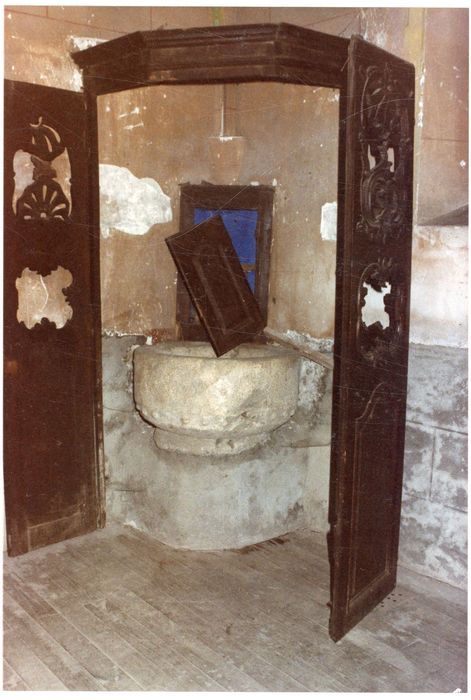 Armoire en bois sculpté et ciré. Armoire à trois côtés de bois, ouvrant tous les trois sur charnières pour démasquer la cuve baptismale. Les panneaux en bois sculpté présentent chacun deux petites baies ouvragées, la supérieure fermée par des entrelacs de bois, l'inférieure seulement ornée sur les bords. Au bas simple moulure. Les fonts baptismaux qu'elle renferme font l'objet d'un autre classement.