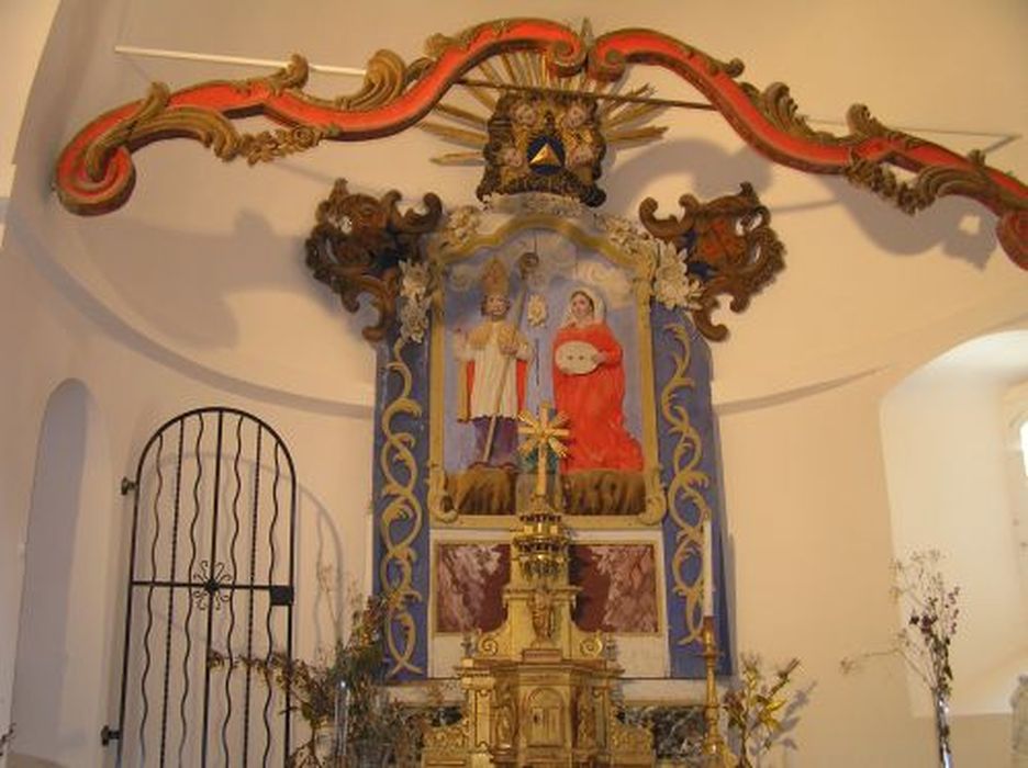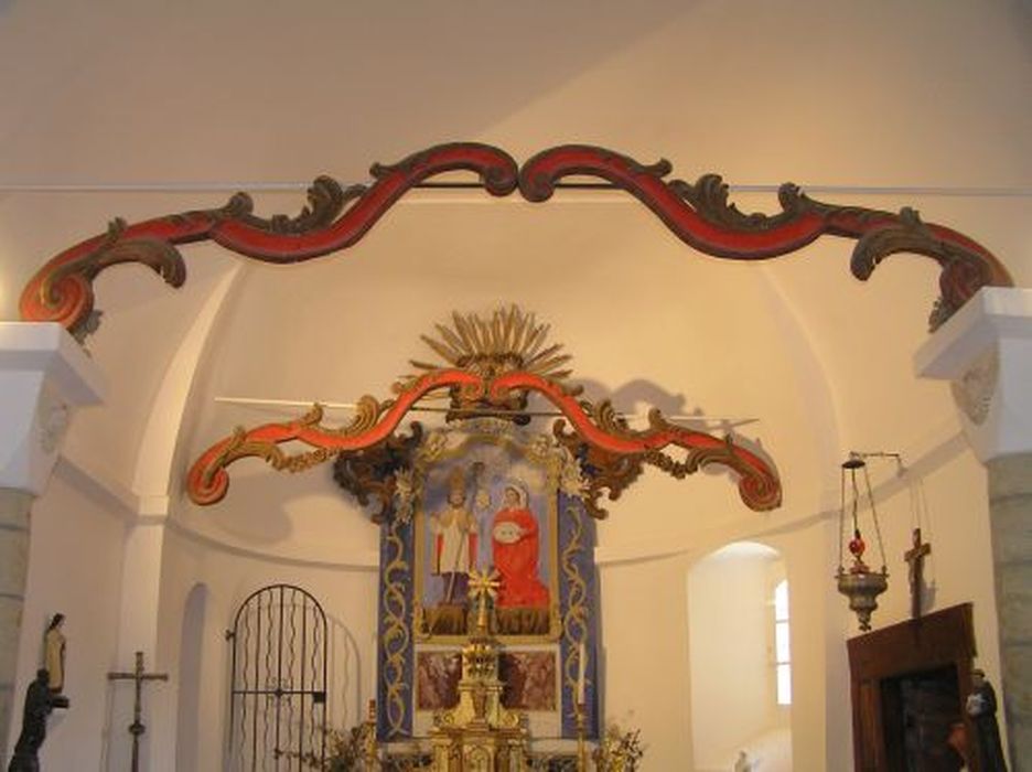 Maître-autel, tabernacle et son dais et retable, en bois peint de couleurs vives et arc triomphal. Tableau central du retable remplaçant un panneau du retable en bois doré et représentant Sainte Lucie et Saint Lizier.