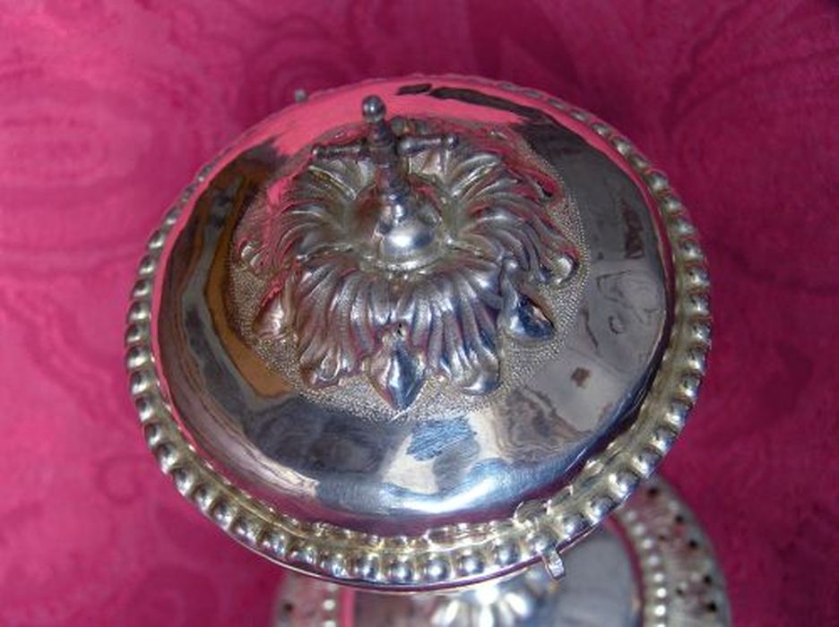 Petit ciboire à pied à bordure ajourée, noeud à oves, décor perlé. 4 poinçons mals insculpés (dont un de ville et un de maître).