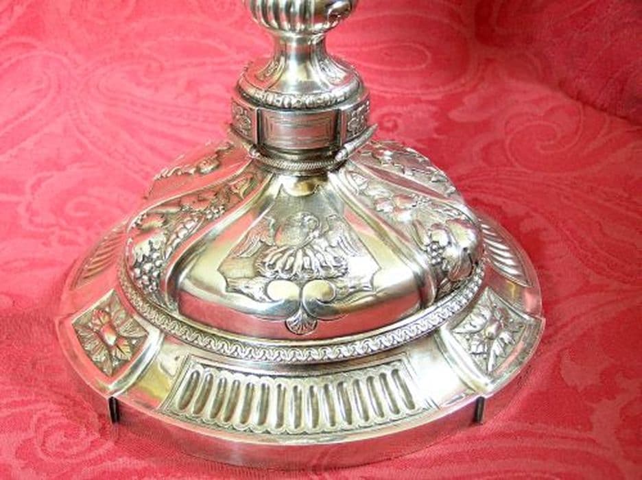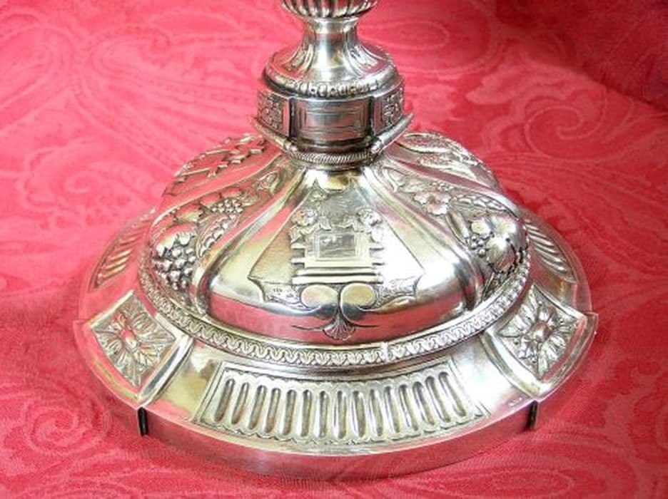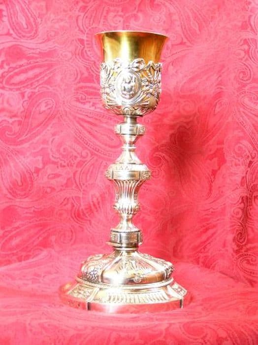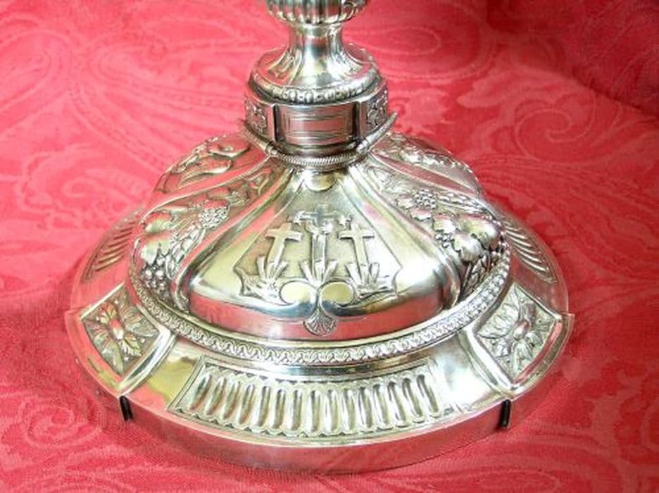 Décor sur la coupe, d'épis de blé et de noeuds de ruban. Décoration assez géométrique sur le noeud tandis que le pied comporte, en relief, une décoration florale stylisée.