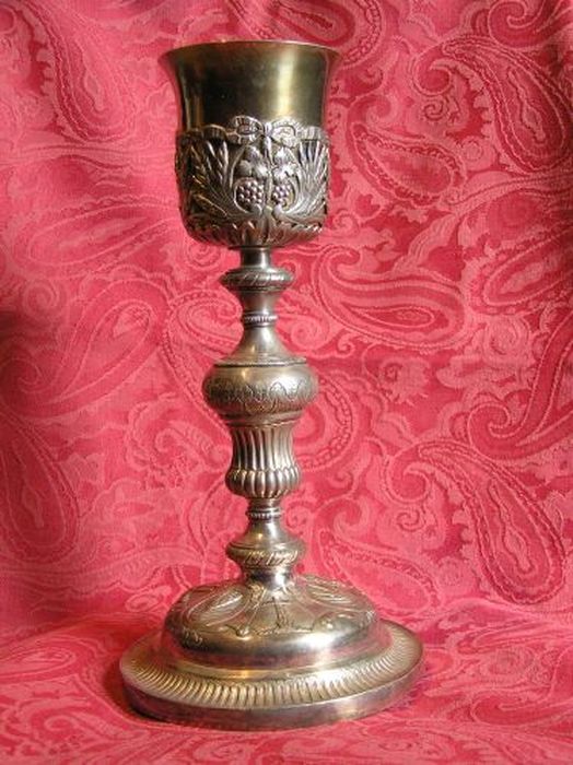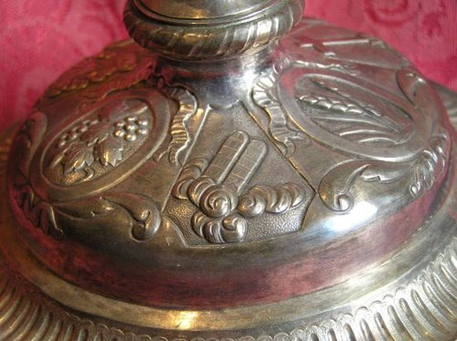 Avec fausse coupe ajourée à noeud de rubans, blé, vigne. Noeud en partie cannelé. Bout du pied cannelé. Pied avec croix, raisins, roseaux, blé. Noeud piriforme entre deux collerettes torsadées.