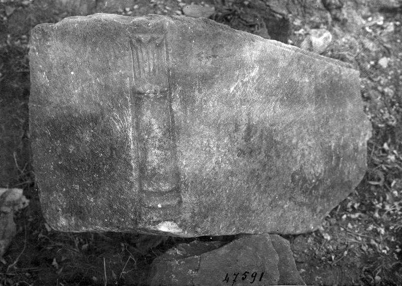 Marbre gris blanc. Angle d'un sarcophage avec colonnette prise dans la masse, .. base à deux tores séparées par une gorge. Astragale. Chapiteau à longues feuilles à peine indiquées. Autre fragment d'angle ne présentant que la base.