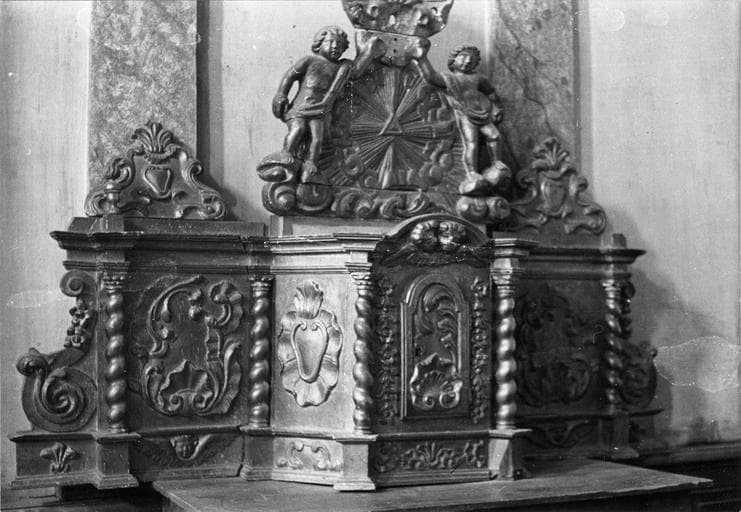 Tabernacle en bois doré composé d'un tabernacle vertical à pans biais (avec porte décorée d'un cartouche et de feuillages et côtés d'un cartouche) et de deux panneaux latéraux avec cartouches et filets fleurs. Le tabernacle est décoré du triangle rayonnant. Les panneaux sont surmontés d'une décoration en triangle avec cartouche et enroulements. Le fronton de ce tabernacle est décoré de deux statuettes d'anges.